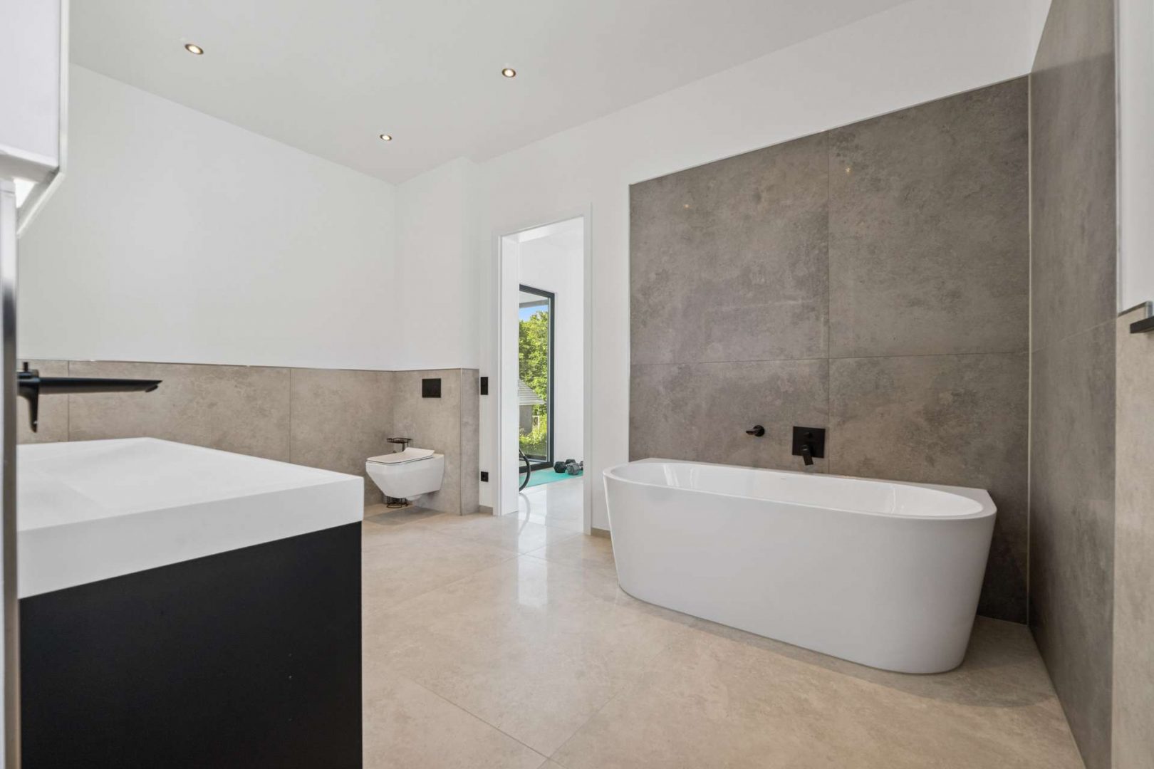 Die Villa bietet sieben flexibel nutzbare Zimmer, darunter vier Schlafzimmer, die ideal für Kinder oder Gäste sind. Drei vollwertige Bäder - jedes mit mindestens einer Dusche, das Hauptbad zusätzlich mit Badewanne - sorgen für Komfort und Privatsphäre. So kann jedes Familienmitglied seinen eigenen Rückzugsraum genießen, ohne Abstriche beim Komfort zu machen.