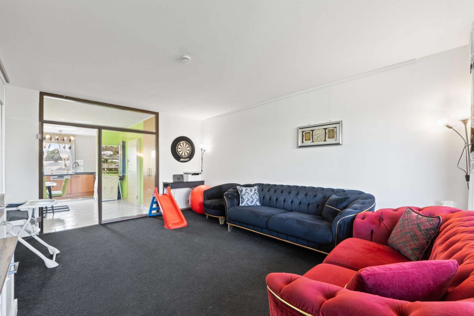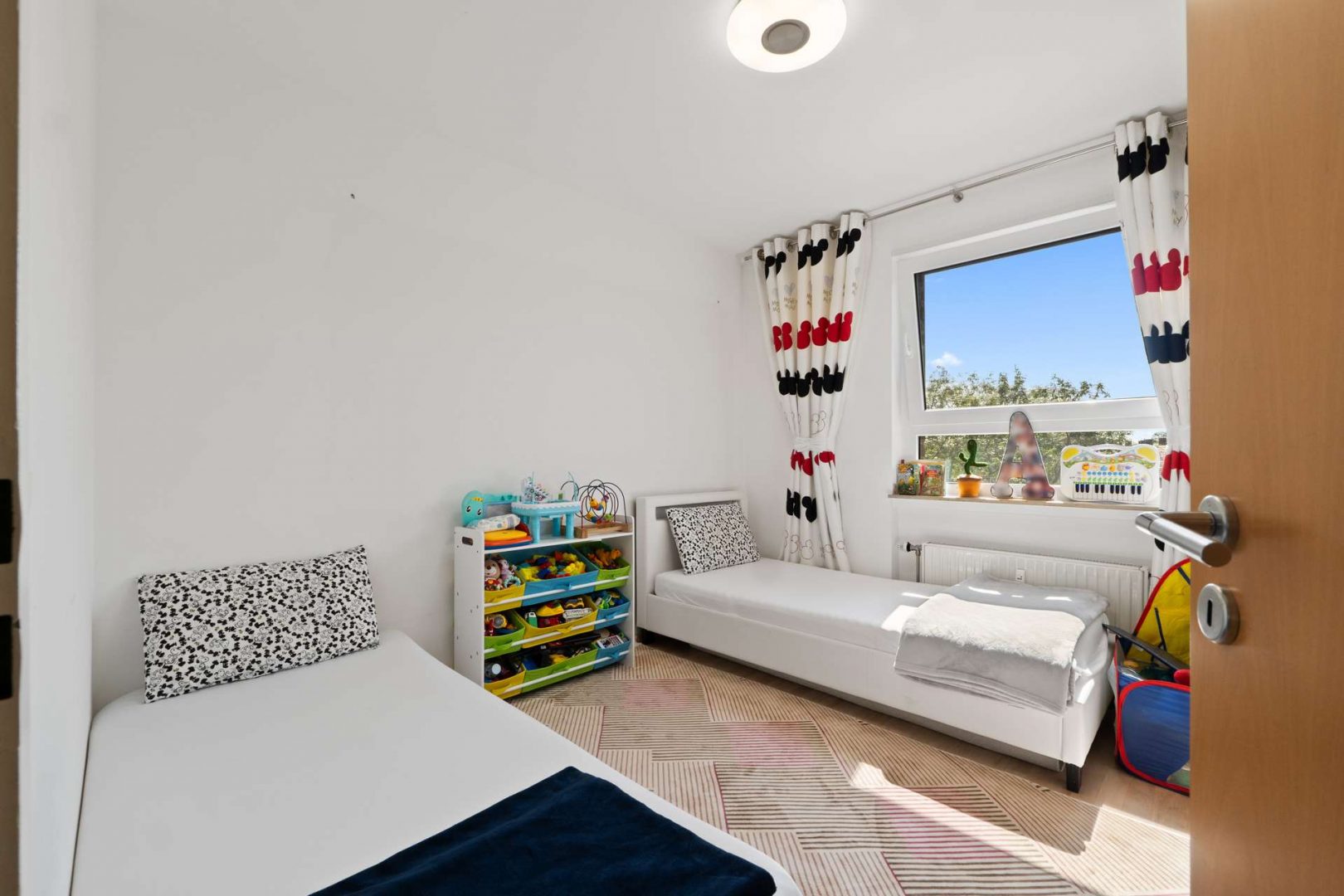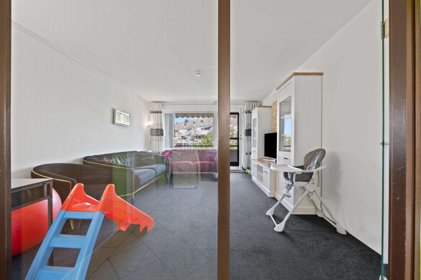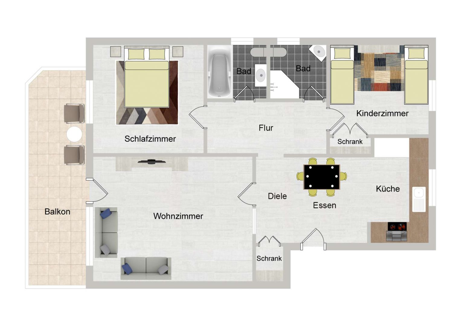 Die Raumaufteilung ist durchdacht und alltagstauglich: Ein großzügiges Wohnzimmer bildet das Herzstück der Wohnung und lädt zum Verweilen ein. Zwei weitere Zimmer lassen sich flexibel als Schlafzimmer, Kinderzimmer oder Büro nutzen. Zwei Badezimmer – eines mit Badewanne, das andere mit Dusche – sorgen für Komfort und Flexibilität, gerade im Mehrpersonenhaushalt.