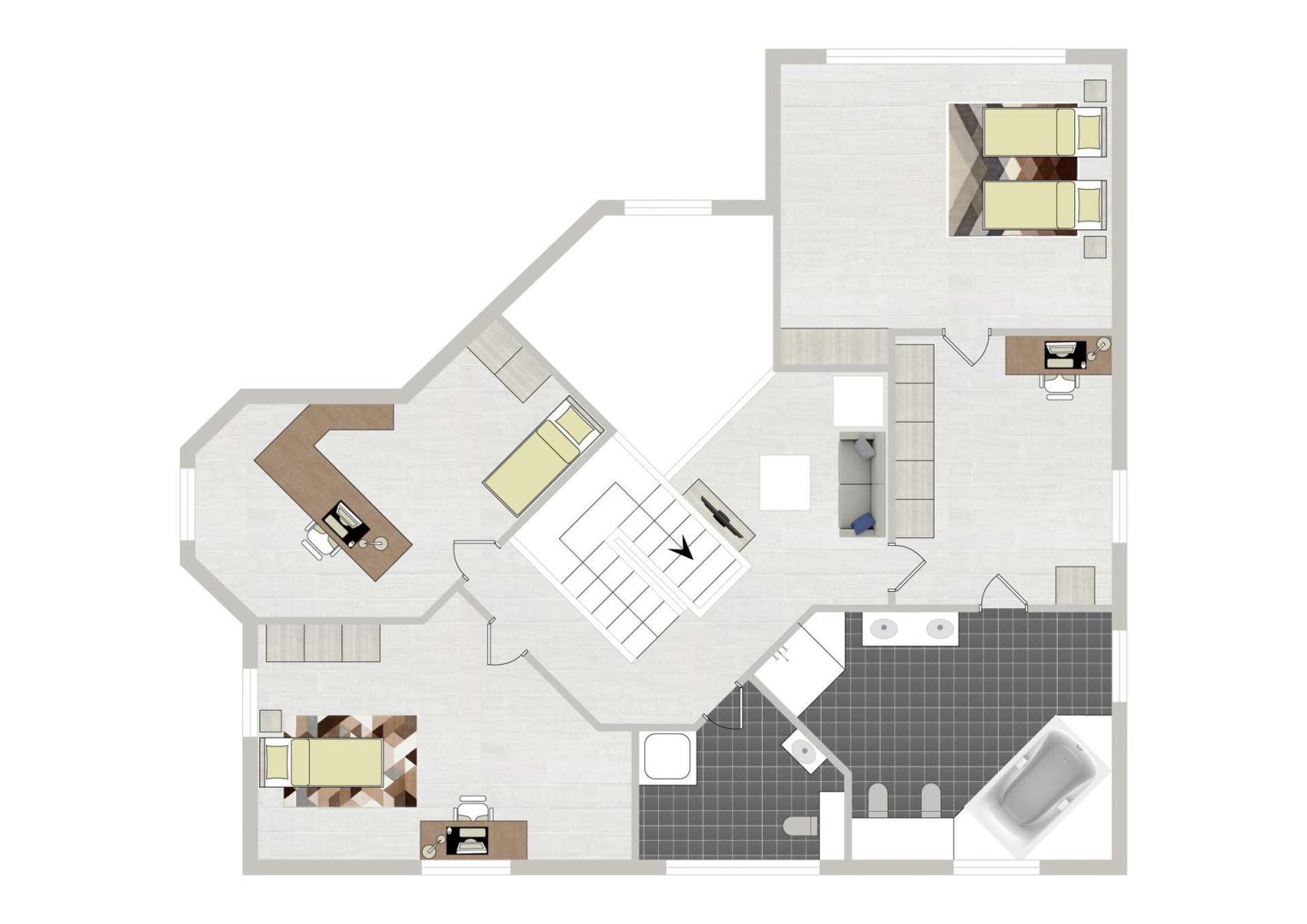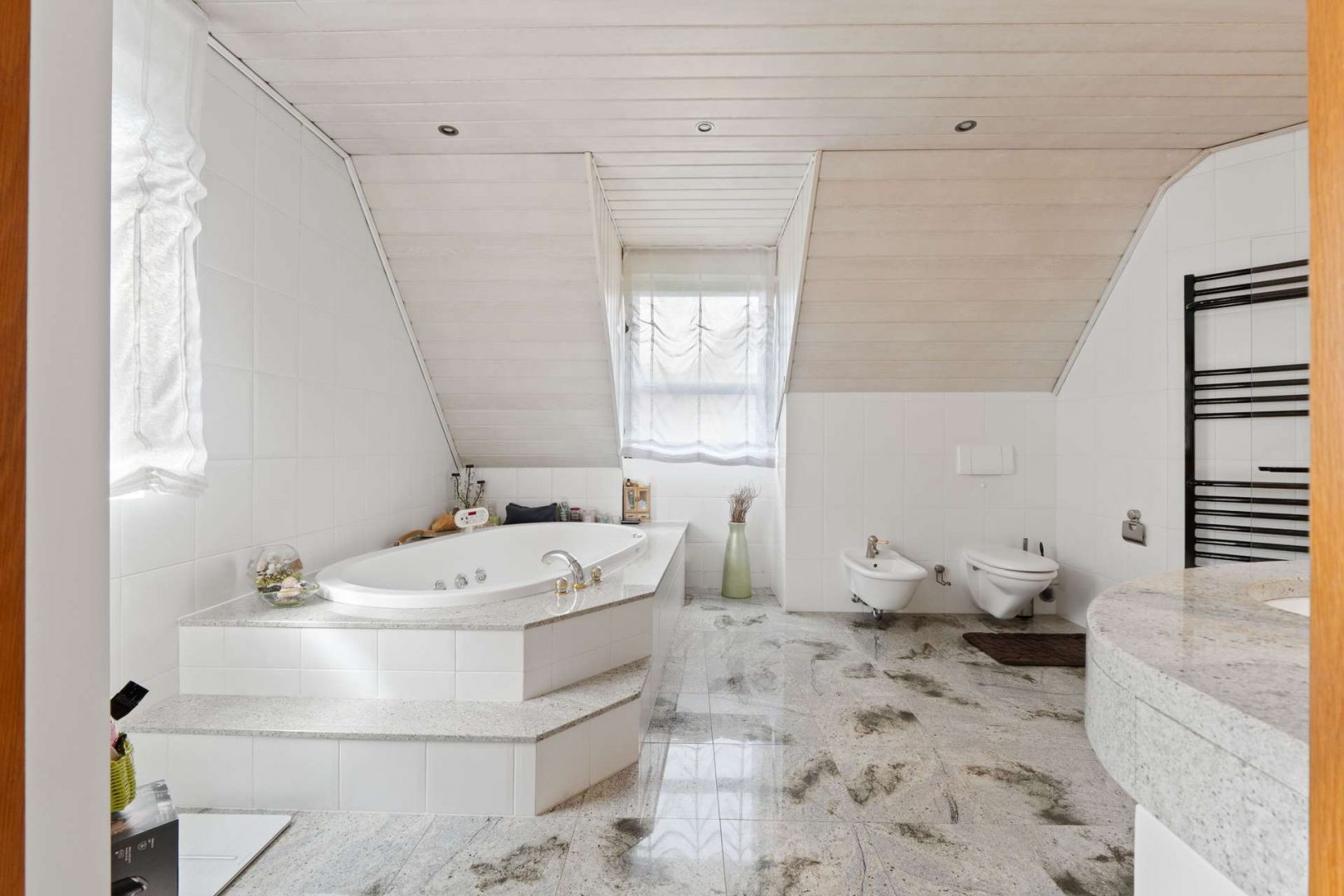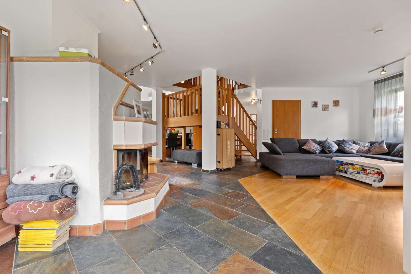 Das großzügige Wohnzimmer besticht durch seine helle, einladende Atmosphäre und bietet dank seiner offenen Gestaltung vielfältige Einrichtungsmöglichkeiten. Große Fensterflächen lassen viel Tageslicht herein und schaffen einen fließenden Übergang zum Garten. Herzstück des Raumes ist der Kachelofen, der nicht nur an kühlen Tagen für wohlige Wärme sorgt, sondern bei Bedarf das gesamte Haus beheizen kann – ein echtes Highlight für gemütliche Abende. Die Bäder verfügen teils über Granit und bieten neben zwei Badewannen auch moderne Duschen. Im großen Badezimmer lädt ein Whirlpool zur Entspannung ein.
