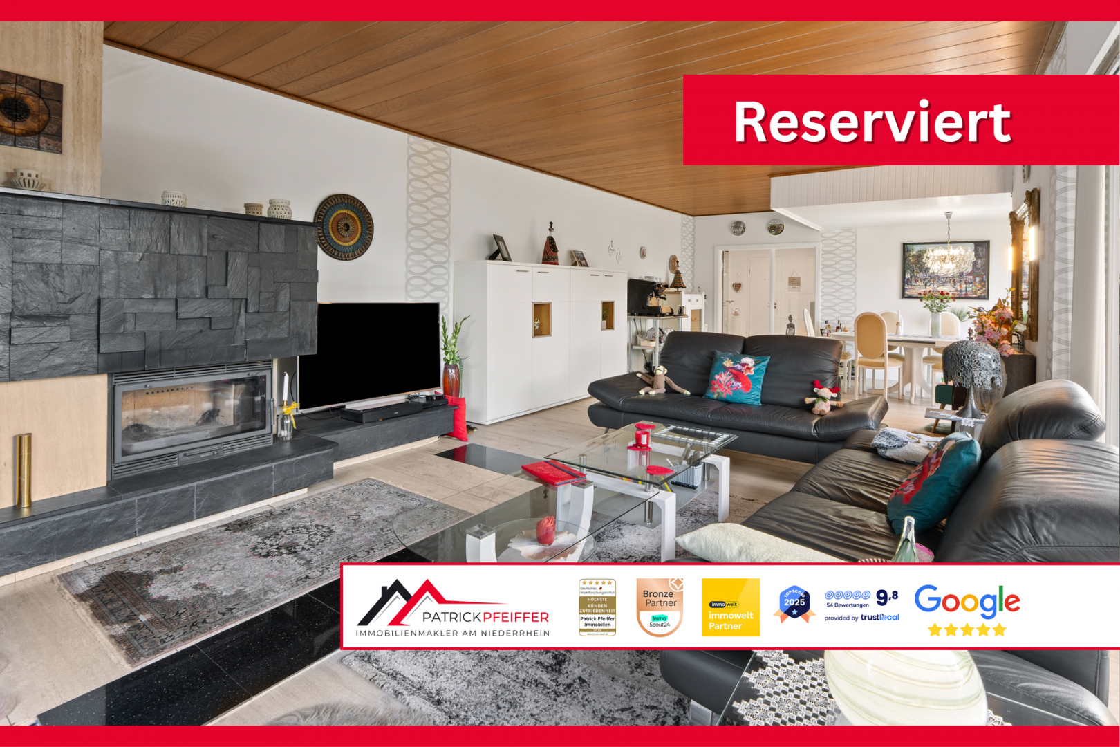 Der Mittelpunkt ist der ca. 37 m² große Wohn- und Essbereich. Große Fensterflächen sorgen für viel Licht, und ein Kamin mit neuer Kassette schafft eine gemütliche Wohnatmosphäre. Vom Wohnzimmer gelangt man wahlweise auf die großzügige Terrasse mit Blick in den Garten oder in die zentrale Diele, die den weiteren Zugang zu den Wohnräumen eröffnet.